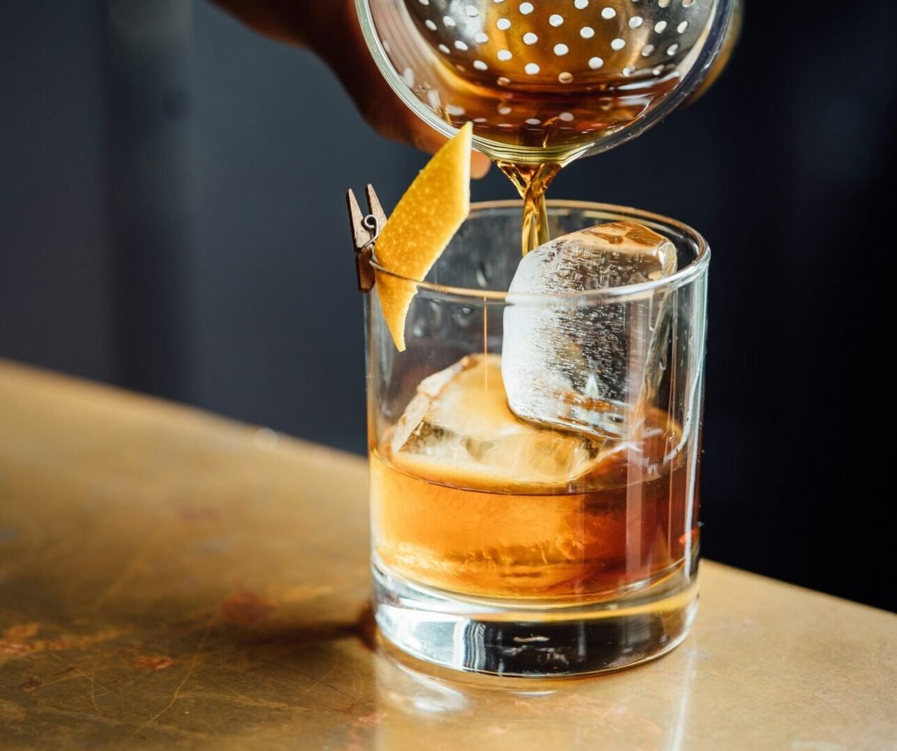 3. Strain into the frosted glass and squeeze the orange peel into the drink.